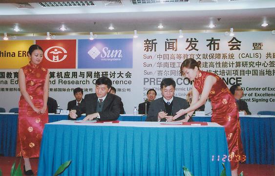 下午2點,大會主辦方之一SUN公司舉行新聞發(fā)布會,與賽爾網絡、華南理工大學、CALIC三方現場簽署了一系列合作協(xié)議。教育部科技司秦正先生、高教司葛道凱副司長出席了協(xié)議簽字儀式。