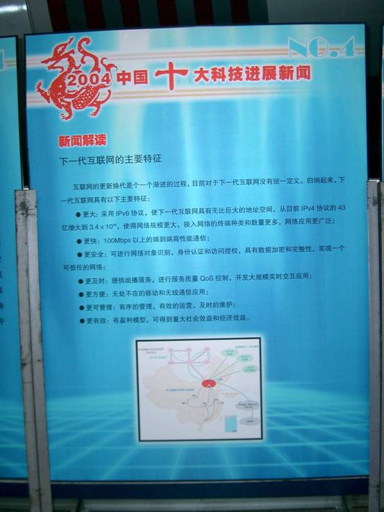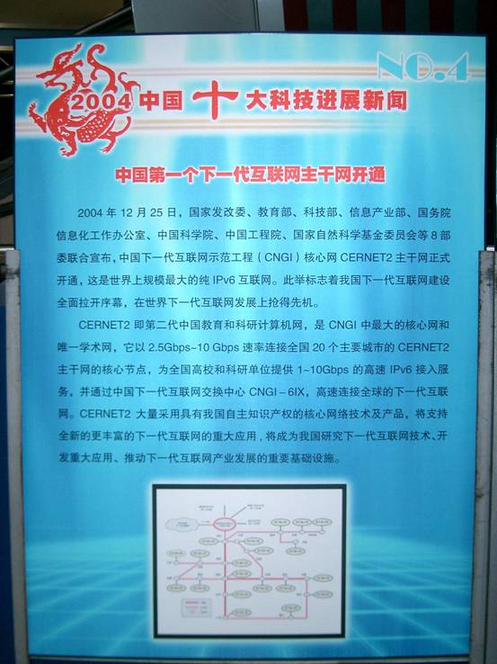日前,“2004年中國(guó)、世界十大科技進(jìn)展新聞”科普展覽在北京中國(guó)科技館開幕。展覽由科學(xué)報(bào)時(shí)社、中國(guó)科學(xué)院院士工作局、中國(guó)工程院學(xué)部工作局和中國(guó)科學(xué)技術(shù)館聯(lián)合舉辦,將在全國(guó)各地科技館巡回展出。此次展覽的主要內(nèi)容是“振邦杯2004年中國(guó)十大科技進(jìn)展新聞和世界十大科技進(jìn)展新聞”,由584名中國(guó)科學(xué)院院士和中國(guó)工程院院士投票選出。作為2004年科技發(fā)展重大事件之一,以中國(guó)下一代互聯(lián)網(wǎng)示范工程CNGI核心網(wǎng)CERNET2也參加了此次全國(guó)巡展,并將以圖文并茂、專家點(diǎn)評(píng)、新聞鏈接等形式,全方位、立體化展現(xiàn)給社會(huì)公眾。